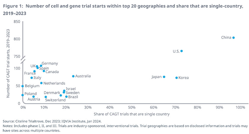 Because of their complexities, CAGT trials tend to have smaller footprints in a few countries or just one, such as in the U.S. For example, while China is growing exponentially in clinical trial activity with 804 trials started in the last five years, 96% of these trials are taking place only in China. Yet, there is a growing representation from the industry.