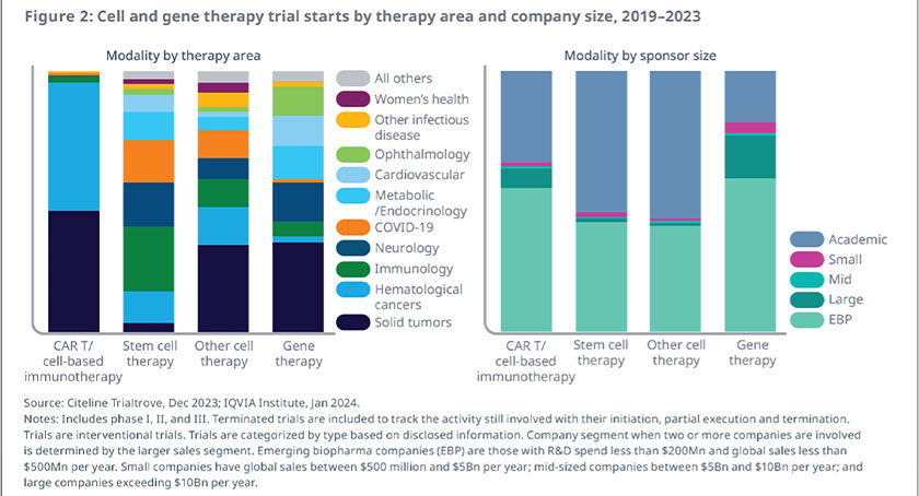 Novel modalities, including antibody-drug conjugates, multispecific antibodies and CAGTs, accounted for 32% of oncology trial starts in 2024, with CAGT trials having tripled in the last decade. However, in recent years, various types of sponsors and companies are investigating CAGTs for a range of diseases. Over the last five years, trial activity has shown notable differences in focus between modality and therapy area, as well as between modality and sponsor size/type.