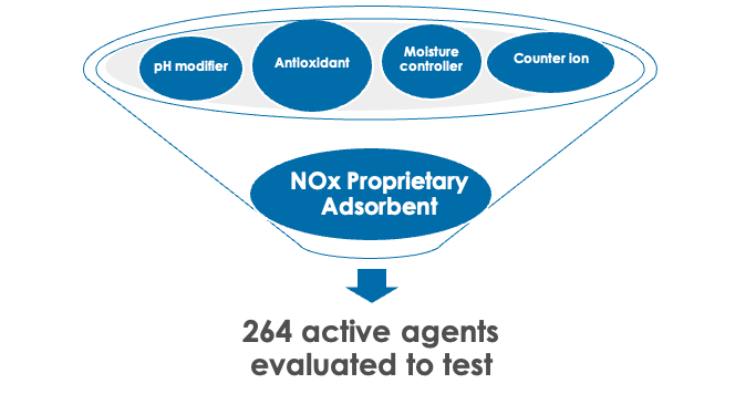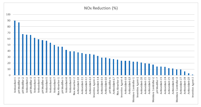 More than 260 diverse NOX mitigant raw materials were identified from literature, with 52 tested in screening studies – including different categories of organic and inorganic materials (antioxidants, adsorbers, pH modifiers, moisture controllers and other innovative agents, etc.) (see Figure 1).