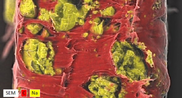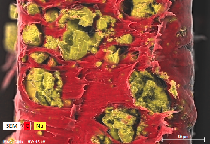 Figure 3. High resolution Scanning Electron Microscopy images coupled with EDX analyses of an active polymer impurity scavenging film