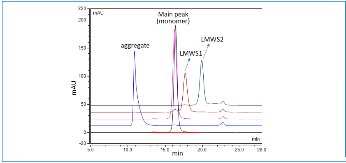 Figure 3: Overlaid SEC chromatograms of unfractionated mAb (black); and aggregate (blue), main peak (magenta), LMWS1 (maroon), and LMWS2 (dark blue) fractions collected from the stressed (65 °C for 7 days) mAb product.