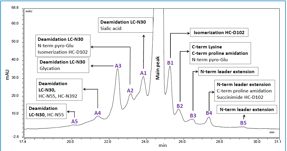 Figure 7: CEX chromatogram of an IgG1 mAb showing PTMs in the acid and basic charge variant peaks identified by RPLC-MS/MS (Note: Only major modifications are shown, high abundant modifications are in bold letters).