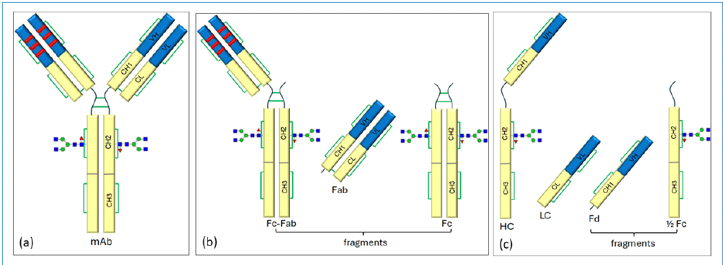 Figure 4: Expected fragments following hinge region cleavage in IgG1 mA, (a) intact mAb, (b) expected fragments in the native