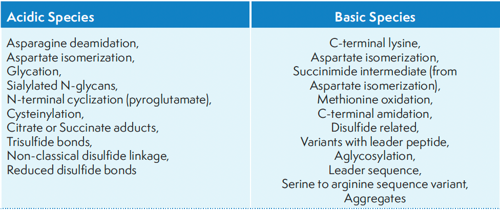 Table I: Common modifications that form acidic and basic charge variants in mAbs.