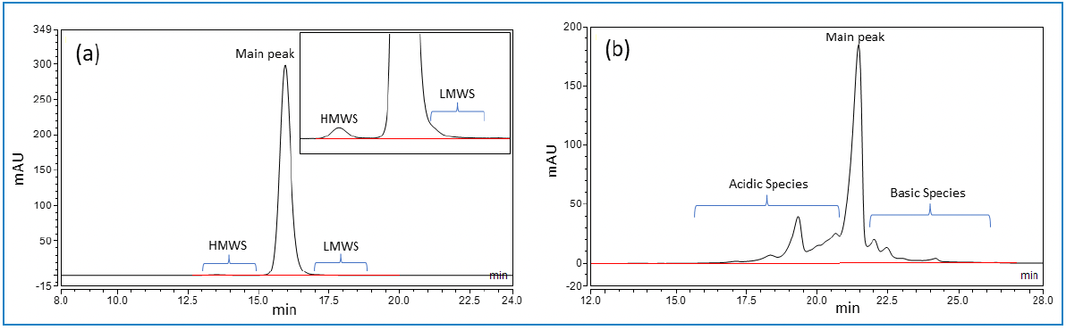 Figure 1: UV chromatogram of IgG1 mAb (a) SE-HPLC (b) CEX-HPLC (Note: HMWS = high molecular weight species, LMWS = low molecular weight species).