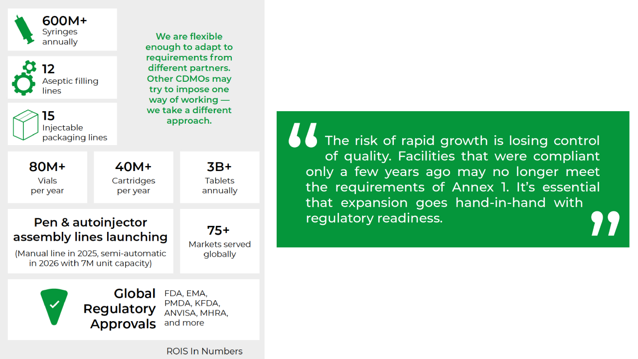 As the GLP-1 market continues to grow in scale and complexity, success will depend on a CDMO’s ability to combine compliance excellence, injectable manufacturing expertise, and strategic adaptability. ROIS is already operating from this foundation. With more than 30 years of injectable experience, multiple sites authorised by major global regulators, and a strong track record in tech transfer and aseptic scaling, ROIS is built to support both current demands and future developments. Its recent investment programme — which includes facility expansions aligned with Annex 1 guidance — reinforces a forward-thinking approach. Whether the next challenge is higher volume, faster turnaround, or a new delivery format, ROIS is equipped to help partners meet it with confidence.