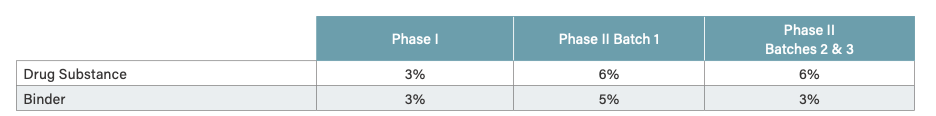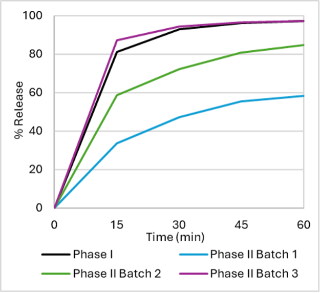 Further development at the pilot scale would be required and two additional batches would be made. The Phase II Batch 2 batch reduced the Binder level back to the previous concentration of 3% and maintained the previous batch’s granulation parameters. This batch demonstrated improved release; however, it was still substantially below the target dissolution rate (Figure 1).