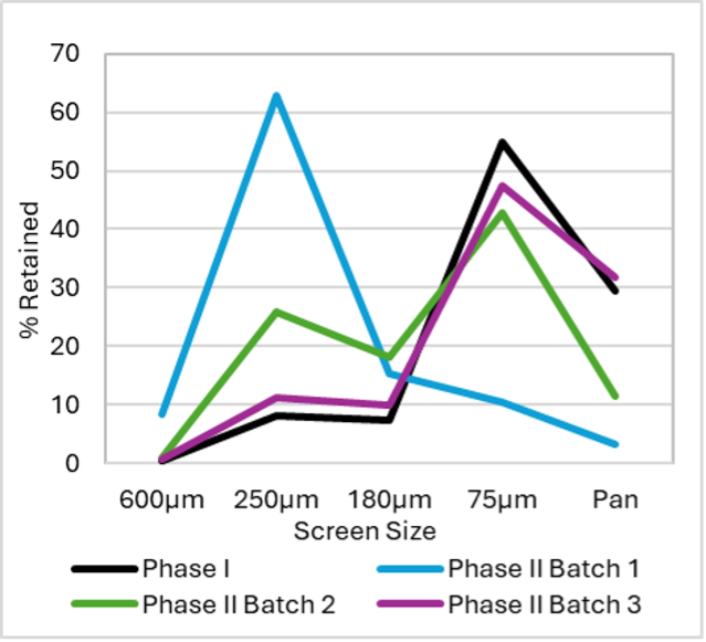 Pilot manufacturing of the initial Phase II Batch 1 formulation was performed using the same operating parameters as the phase I formulation. The resulting product dissolution was significantly slower than the Phase I batch and can be seen in Figure 1. The particle size of Phase II Batch 1, displayed in Figure 2, was significantly greater than the Phase I batch, indicating the wet granulation process was more efficient than during the previous phase I GMP batches.