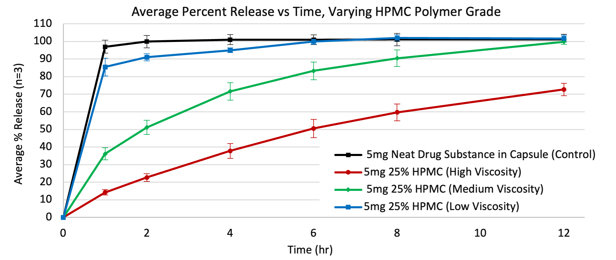 Maintaining a controlled and consistent drug release profile is crucial in the early-stage development of oral solid-dose (OSD) drug products. If initial pharmacokinetic (PK) data of an instant-release tablet or capsule indicates a maximum concentration (Cmax) above the targeted therapeutic range, development of an extended-release drug product may be necessary. An extended-release tablet or capsule is designed to provide a controlled drug release profile over a specified timeframe, therefore ensuring that Cmax remains within the targeted therapeutic range.