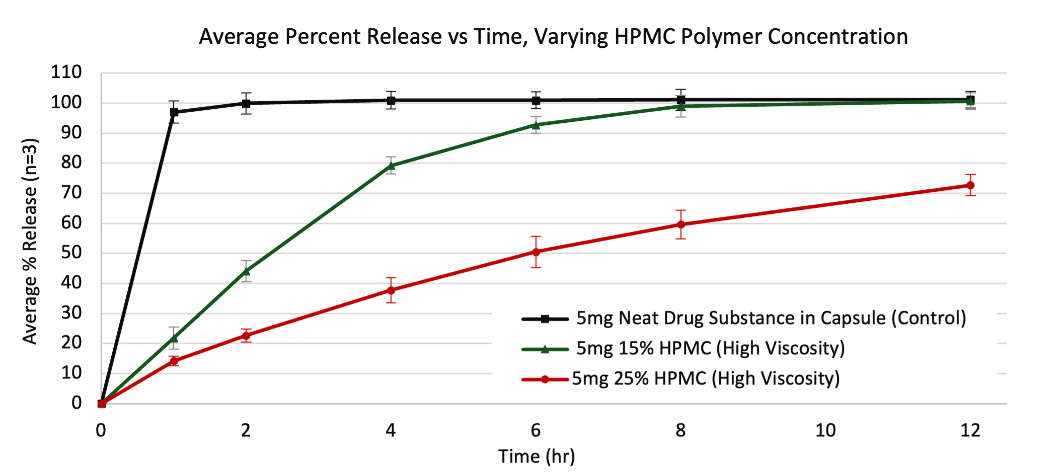 As shown, formulation composition can be varied to achieve a range of target release profiles. If Cmax issues arise during clinical studies, formulation of a phase appropriate extended-release drug product can aid in progressing a drug candidate through early-stage development.