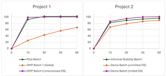 Before proceeding with scale up for the drug product, micronization was implemented to reduce the drug substance particle size and another small demo batch was prepared. Particle size reduction resolved the dissolution issue, and micronization was subsequently implemented prior to manufacture of subsequent batches. By aligning the drug substance and drug product scale-up work and ensuring critical quality attributes are addressed early in the project, the GMP batch was manufactured successfully, passing all release specifications including dissolution. It is critical to control the drug substance particle size to maintain control of drug product dissolution performance (Figures 5a and 5b).