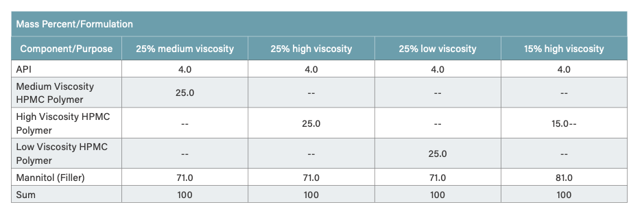 Table 2 outlines the composition of 12 hour extended-release capsule formulations prepared by dry blending drug substance with HPMC polymers of differing viscosities. Mannitol was incorporated as a water-soluble filler. A filler with lower water solubility could have significantly different results on matrix formation and dissolution. Capsules were prepared at a 5mg dosage strength and subjected to dissolution testing. Figure 3 highlights the effect of polymer viscosity on matrix formation and subsequent release. Compared to control capsules filled with neat drug substance, formulations prepared with high-viscosity polymers offered slower release times than formulations prepared with low-viscosity polymers. In this specific formulation, mannitol acted to disperse polymer and drug substance to enable formation of an appropriate matrix upon capsule disintegration. Figure 4 highlights the effect of polymer percent loading on capsule release, with 15% high-viscosity polymer loading resulting in a quicker release profile than 25% high-viscosity polymer loading.